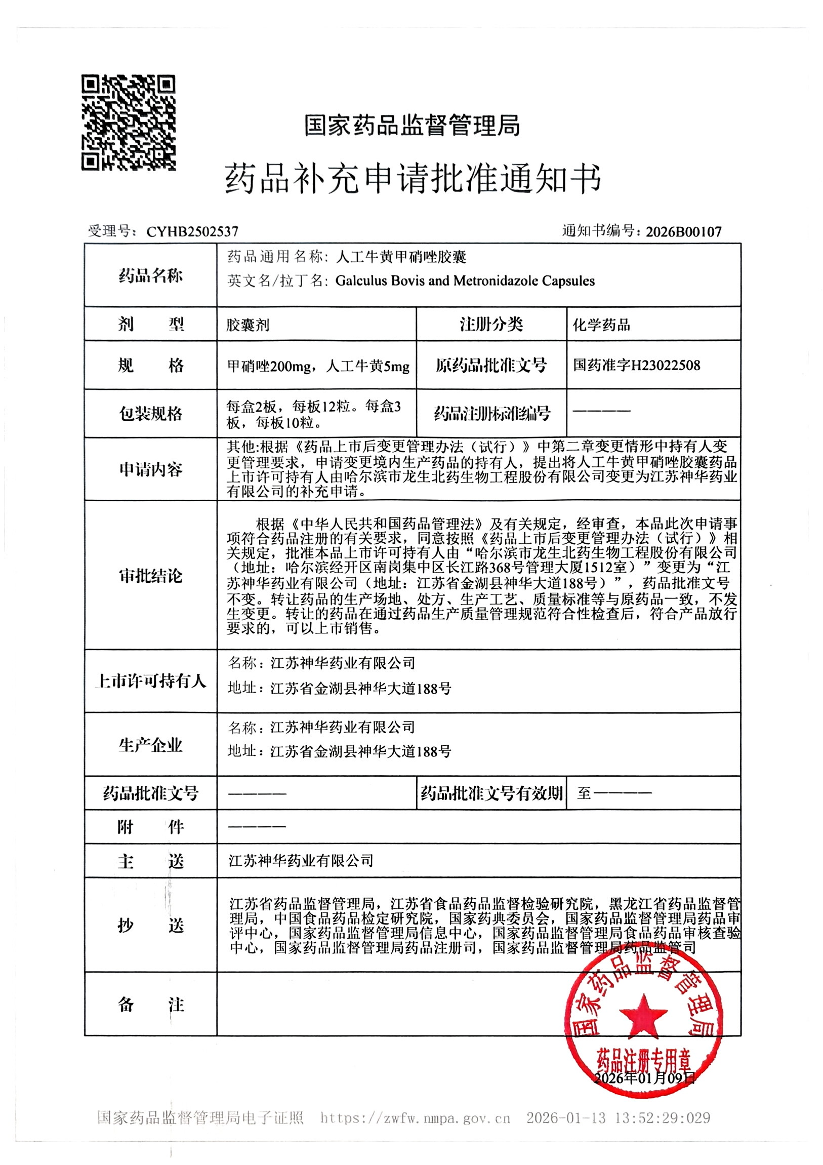 2026年1月9日,人工牛黄甲硝唑胶囊药品上市许可持有人由哈尔滨市龙生北药生物工程股份有限公司变更为江苏神华药业有限公司的补充申请获国家药品监督管理局批准。