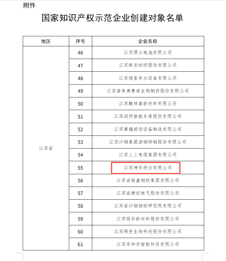 热烈祝贺江苏神华药业有限公司入选2025-2027年国家知识产权示范企业创建对象